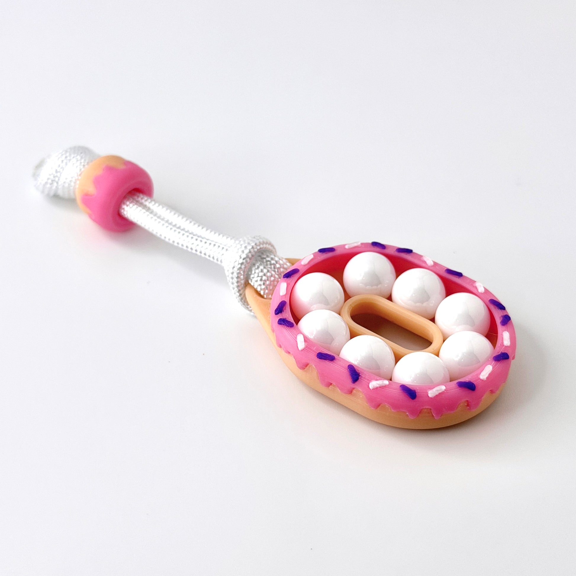 Pink Frost Drip / Tan Donut Base / Purple + Pearl White Sprinkles / ZrO₂ Balls